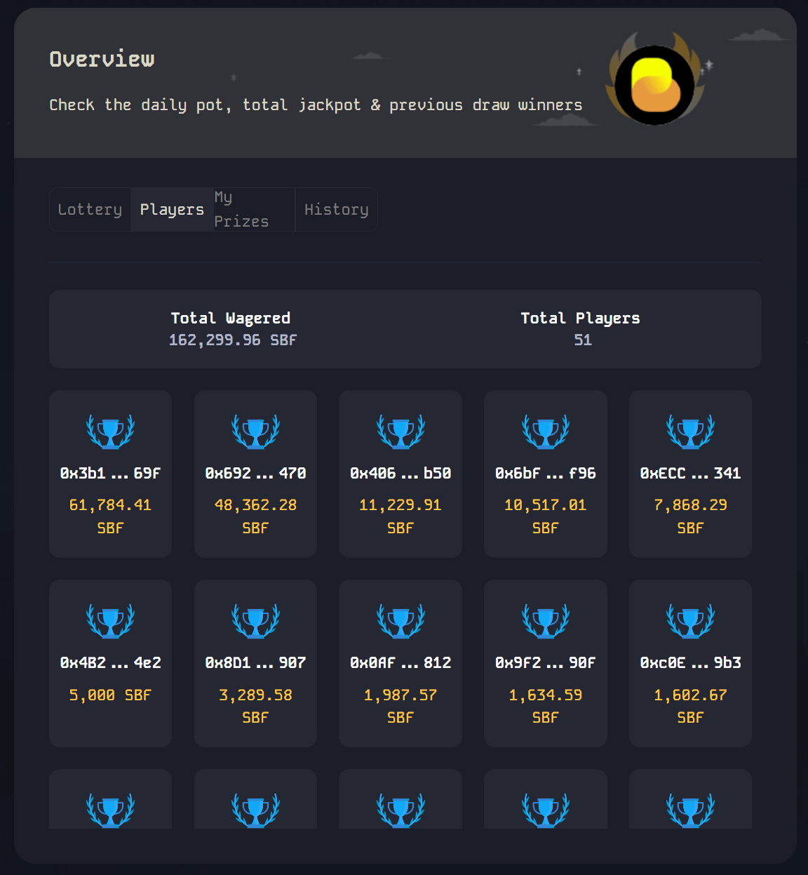 • Lottery winners will always be paid out every 20 hours, with 100 prizes, or the total amount of players if less than 100, paid out regularly and the chance of winning depending on the amount of SBF a user wagers.