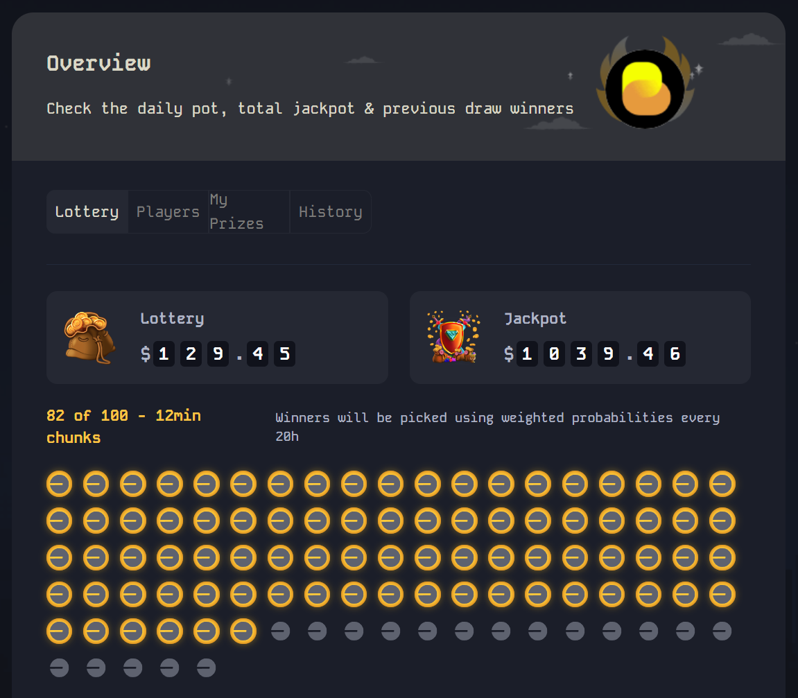 A countdown is shown within the UI as well as the prizes for the current lottery round and the jackpot.